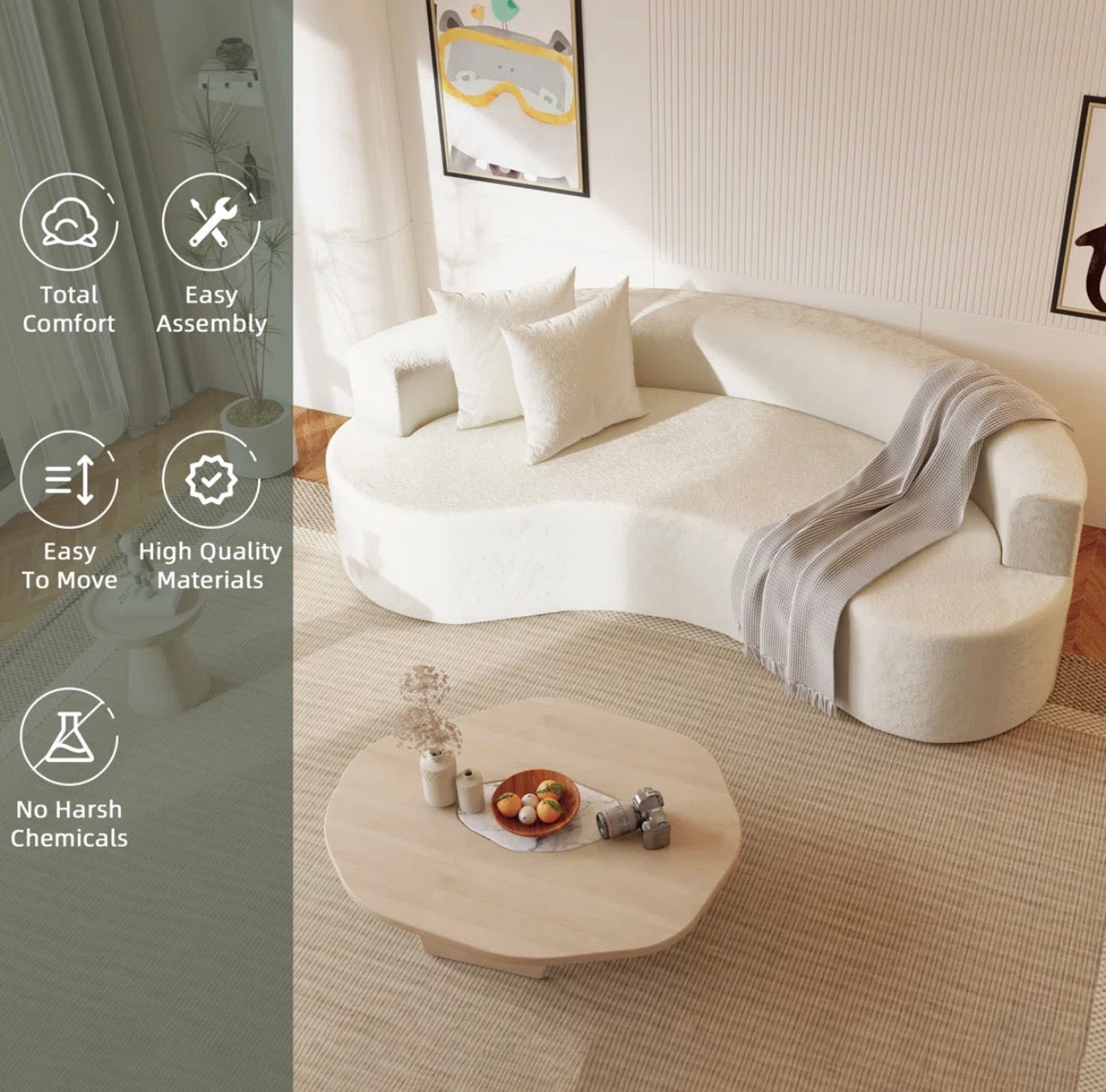 The sculpted curved silhouette enhances your living room’s flow, creating a cozy yet stylish centerpiece ideal for modern, minimalist, or Scandinavian interiors. Designed with plush soft pillows, comfy armrests, and high-density cushioning, it offers total comfort for lounging, entertaining, or relaxing after a long day.