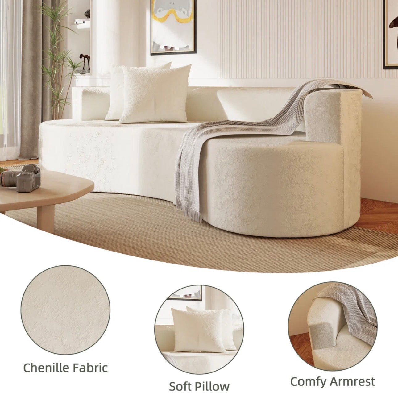 Bring elegance and comfort to your living space with our Curved Chenille Modern Sofa — a perfect blend of luxury design and everyday functionality. Upholstered in ultra-soft chenille fabric, this contemporary sofa adds a warm, inviting texture that feels as good as it looks.