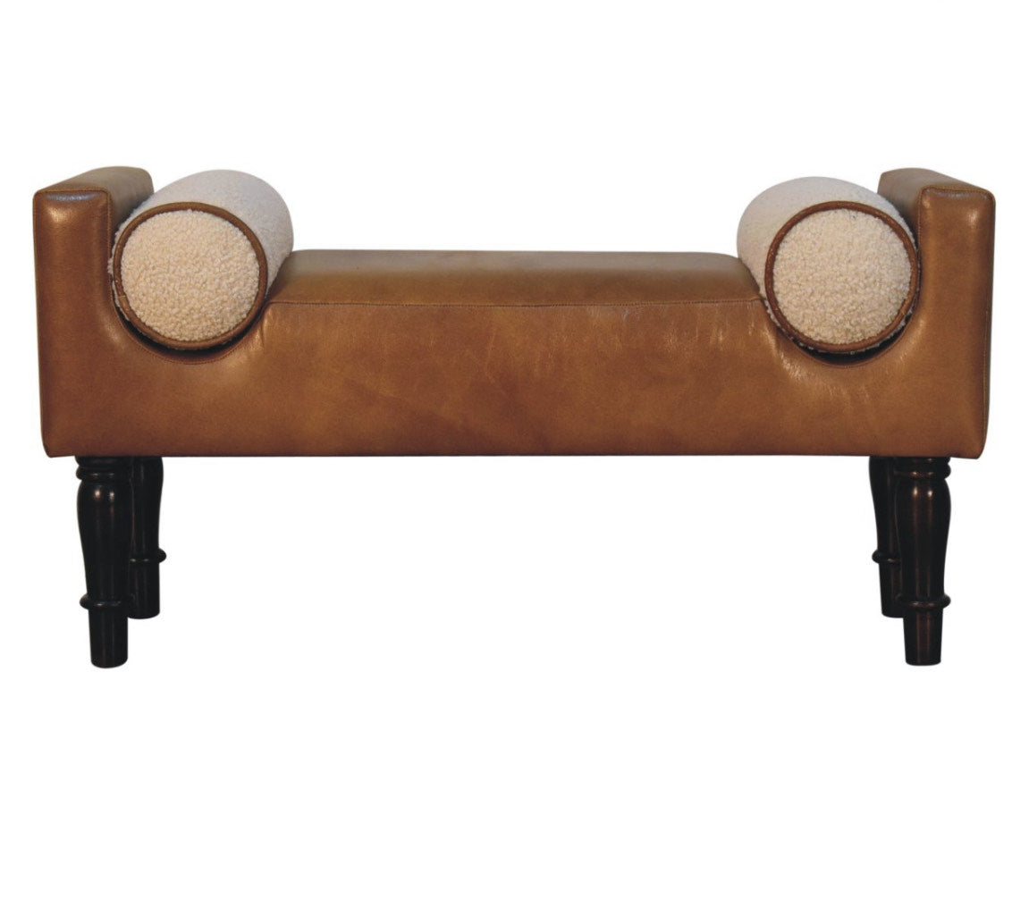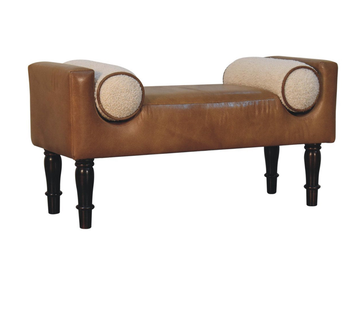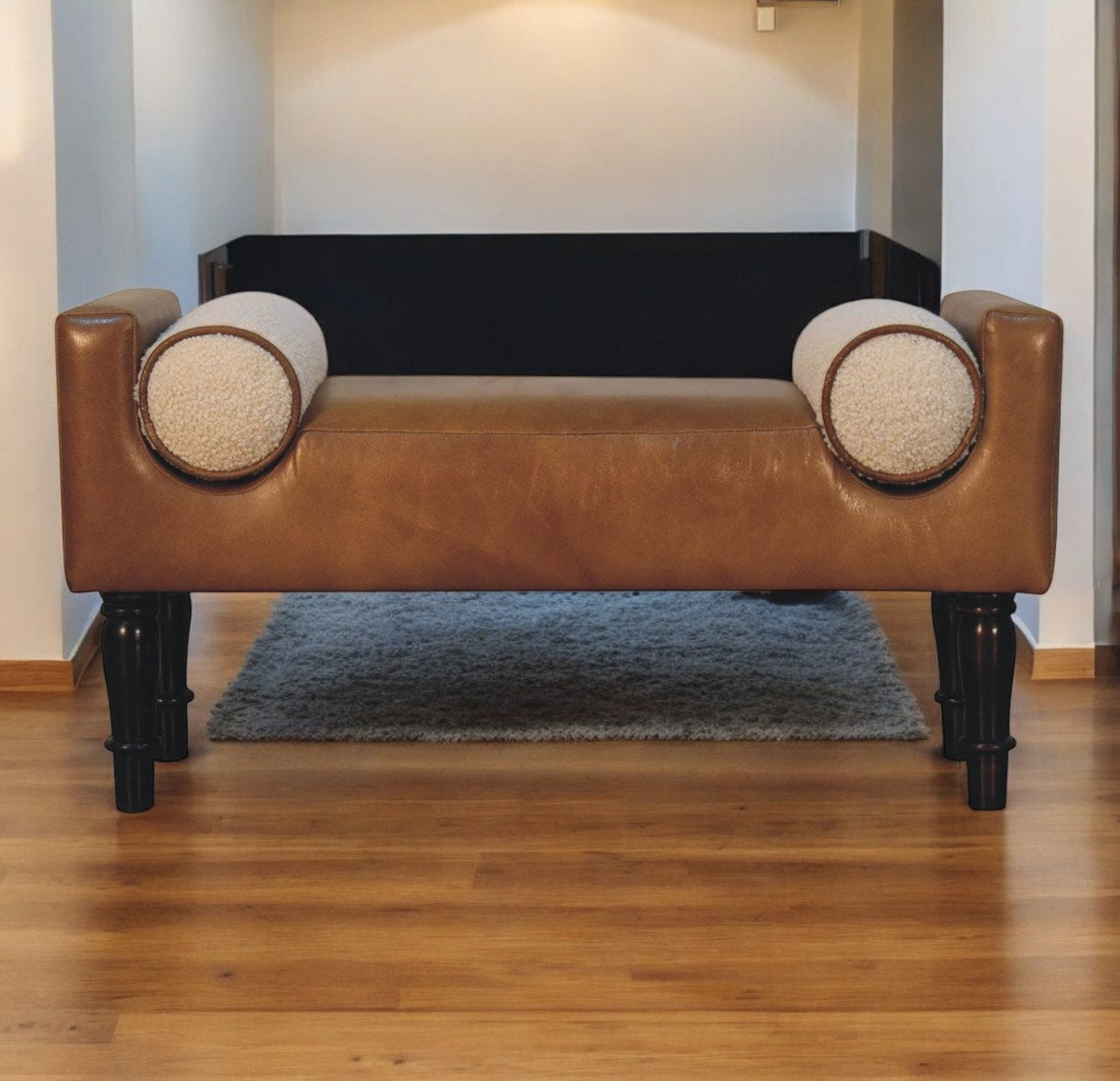 Add timeless sophistication to your home with our Vintage Leather & Bouclé Bench — a versatile piece that blends classic charm with modern texture. Featuring rich cognac-brown leather upholstery, plush bouclé bolster pillows, and elegant turned wood legs, this bench offers both style and comfort. Perfect for an entryway, bedroom, or living room accent, it invites conversation while providing practical seating.